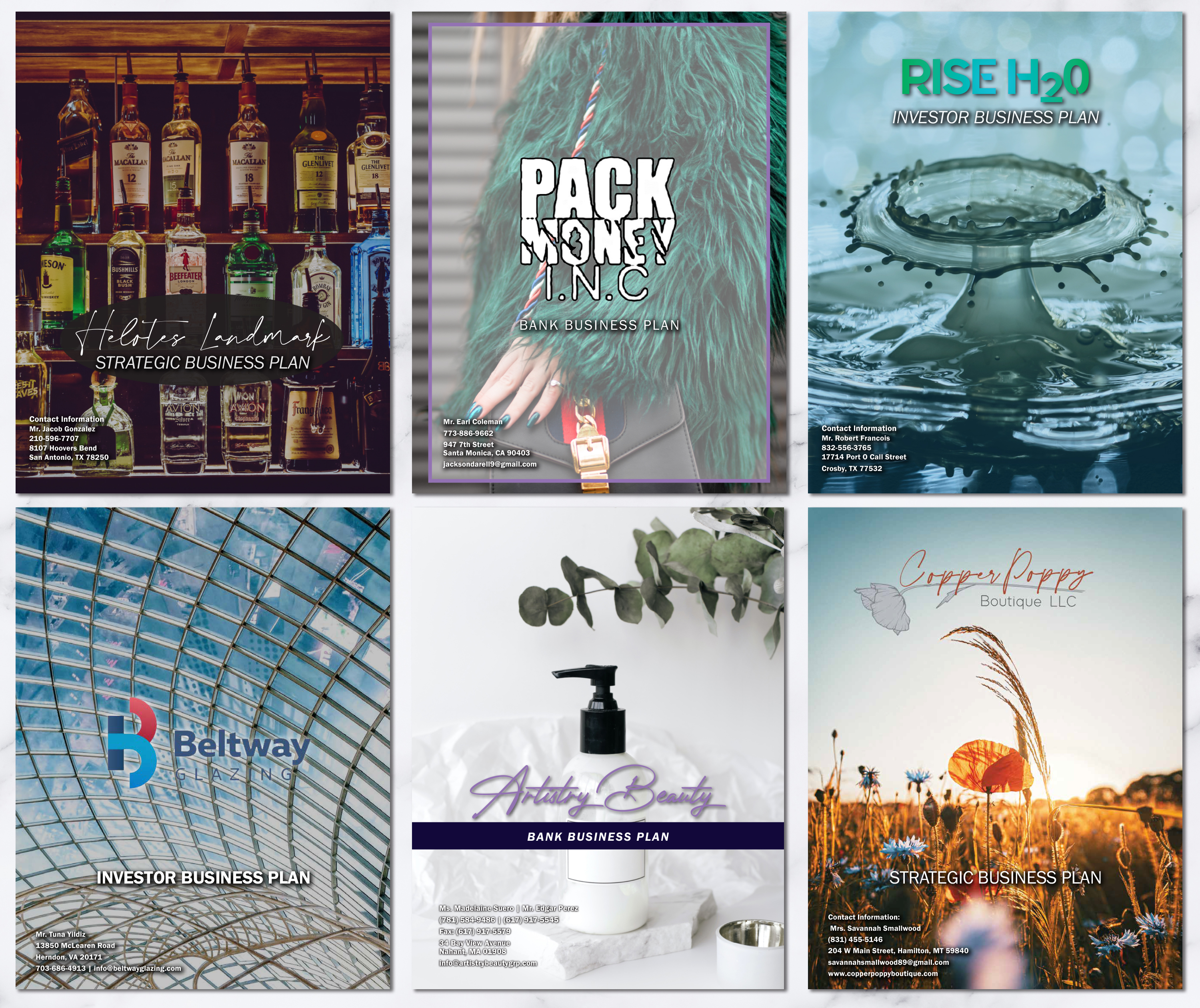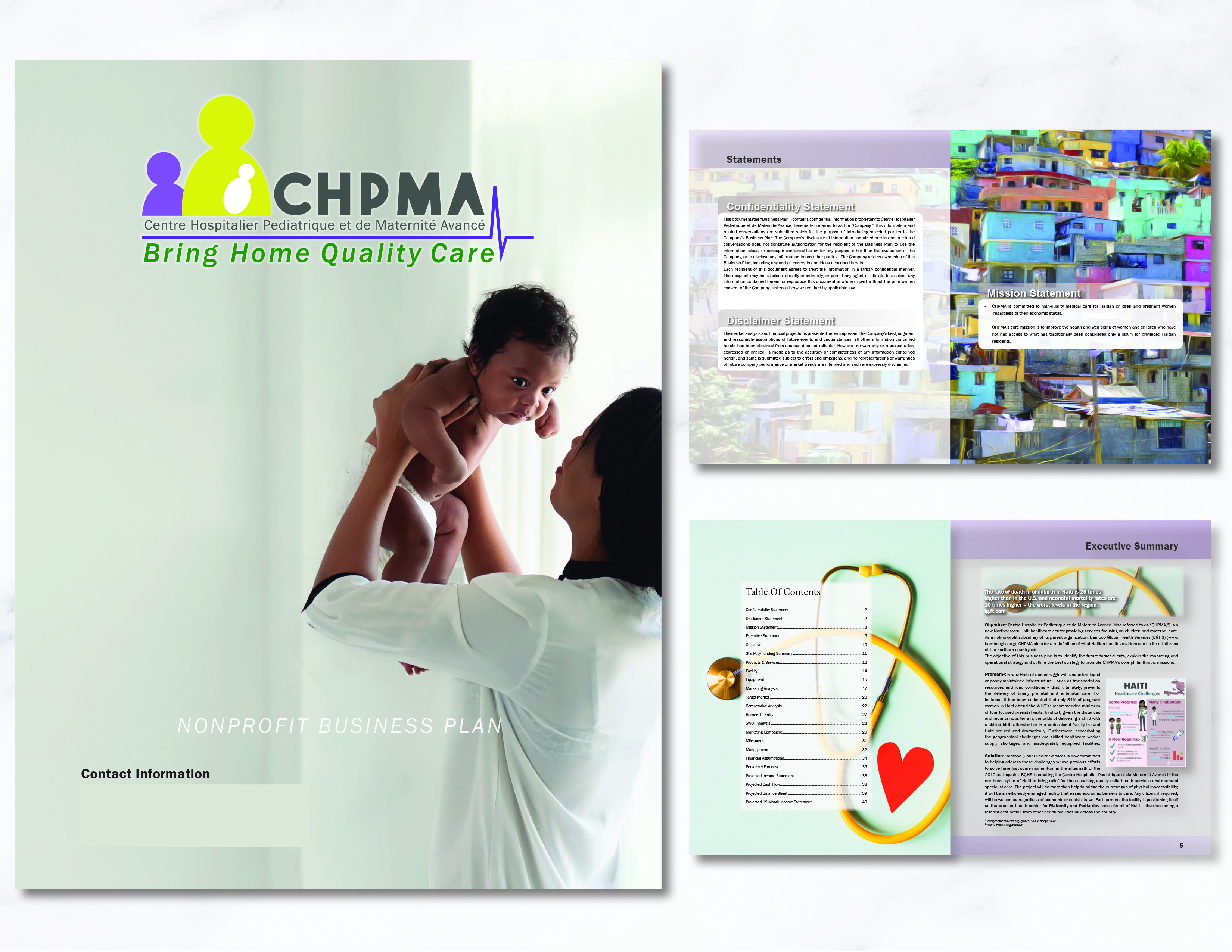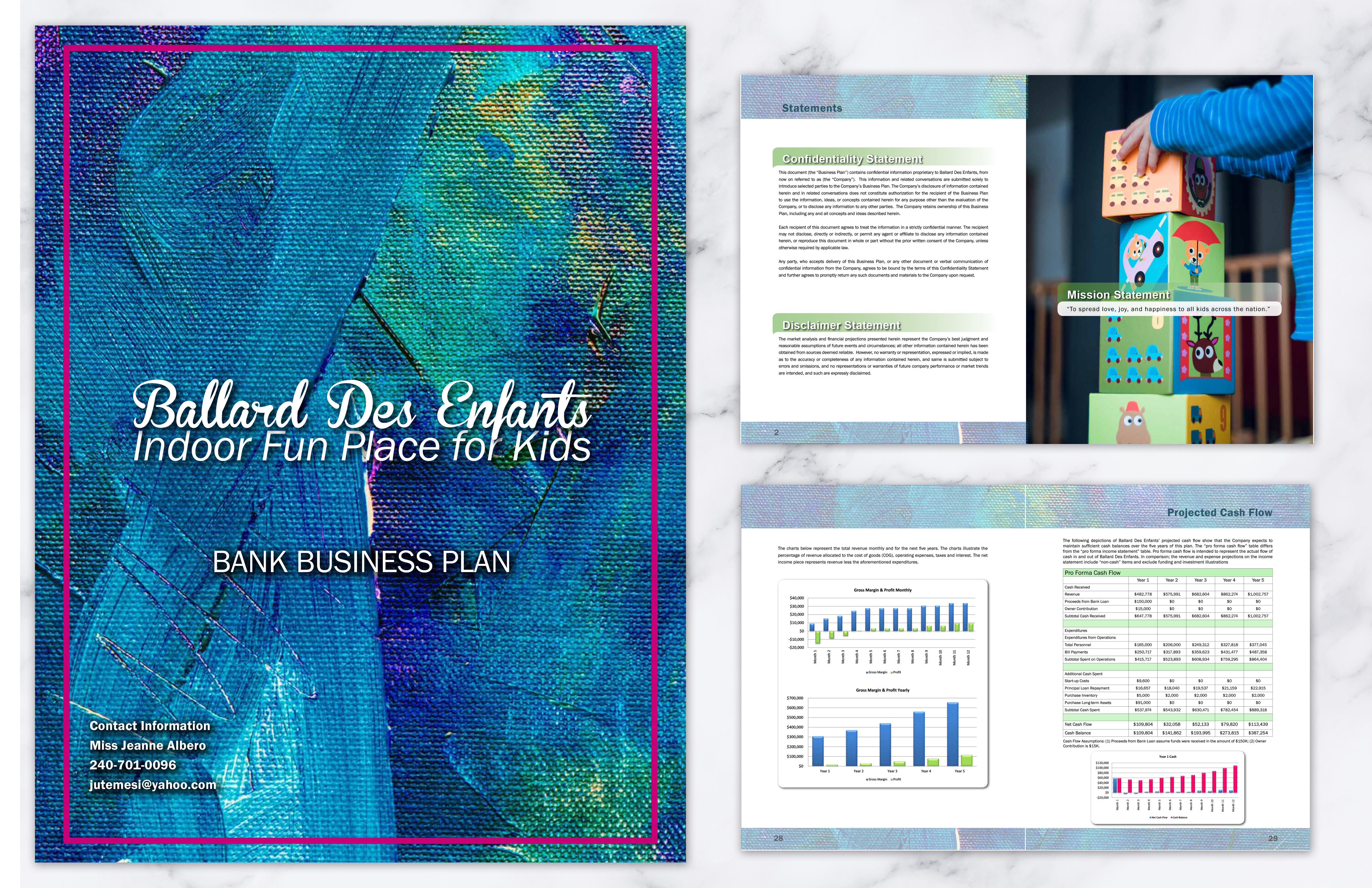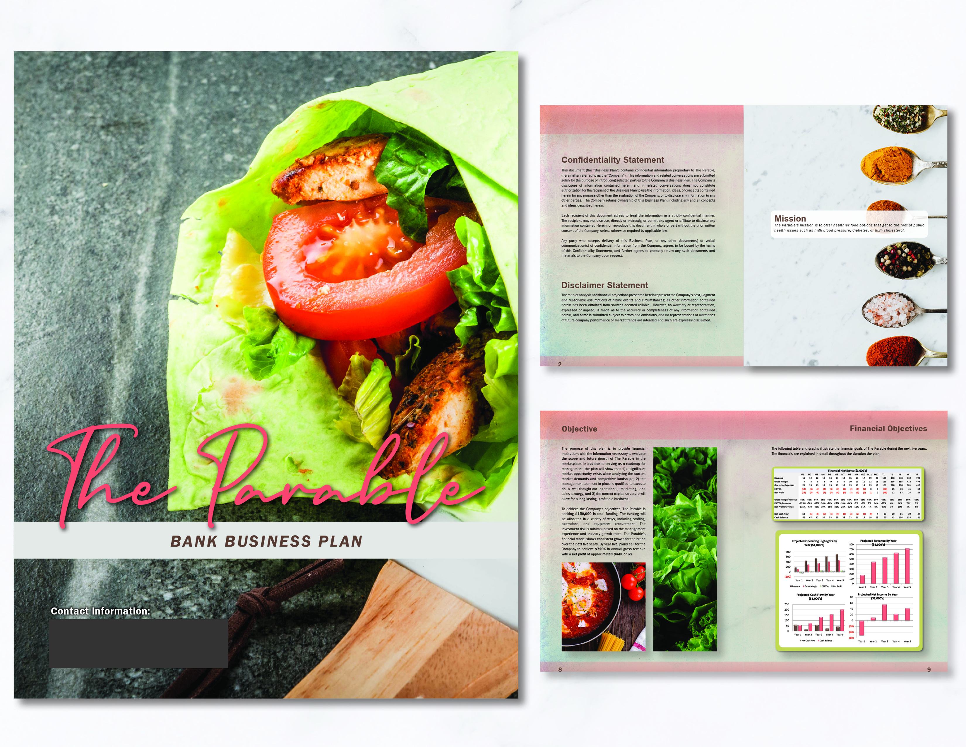 Business plans are carefully designed to ensure the reader not only understands the important information within but also enjoys reading the 36-48 page plan. The following images highlight the cover and first two pages of a typical plan.
